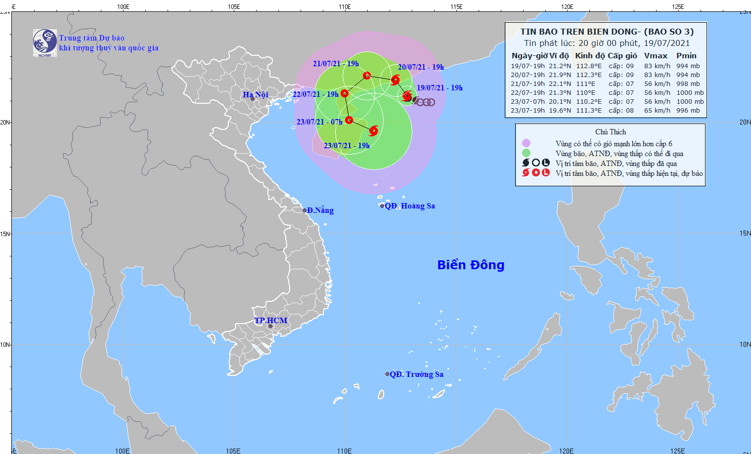 Dự báo trong 24 giờ tới, bão di chuyển chậm theo hướng Tây Bắc. Đến 19 giờ ngày 20/7, tâm bão trên vùng ven biển phía Tây Nam tỉnh Quảng Đông (Trung Quốc). Sức gió mạnh nhất vùng gần tâm bão mạnh cấp 9 (75-90km/giờ), giật cấp 11.