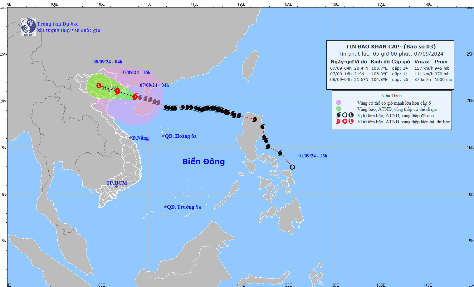 Hồi 4h ngày 7/9, vị trí tâm bão số 3 ở vào khoảng 20,4 độ Vĩ Bắc; 108,7 độ Kinh Đông, trên vùng biển vịnh Bắc Bộ; cách Móng Cái (Quảng Ninh) cách khoảng 180km về phía Đông Nam, cách Quảng Ninh - Hải Phòng khoảng 220km về phía Đông Đông Nam.