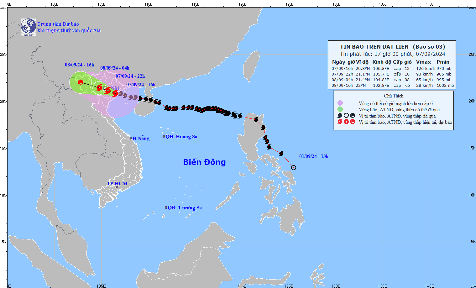 Dự báo, trong 24 giờ tới, bão số 3 tiếp tục di chuyển theo hướng Tây Tây Bắc, tốc độ 15-20km/h, đi vào đất liền phía Đông Bắc Bộ. Đến 4h sáng mai (8/9), vị trí tâm bão trên đất liền phía Đông Bắc Bộ với sức gió mạnh cấp 8, giật cấp 10.