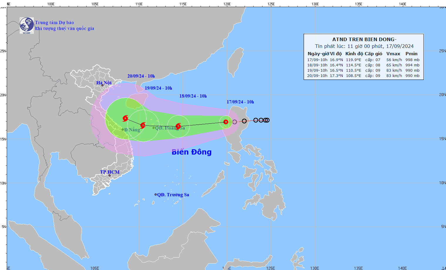 Theo bản tin 11h trưa nay (17/9), Trung tâm Dự báo khí tượng thủy văn quốc gia cho biết, áp thấp nhiệt đới đã đi Biển Đông. Dự báo 24 giờ tới mạnh lên thành bão số 4 (cấp 8), di chuyển chủ yếu theo hướng Tây, tới khu vực biển quần đảo Hoàng Sa đổi hướng Tây Tây Bắc.