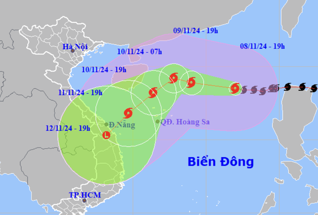 Theo Trung tâm Dự báo khí tượng thủy văn quốc gia, lúc 19 giờ ngày 8-11, vị trí tâm bão số 7 ở vào khoảng 18,5 độ Vĩ Bắc, 117 độ Kinh Đông, trên vùng biển phía Đông khu vực Bắc biển Đông. Sức gió mạnh nhất vùng gần tâm bão mạnh cấp 14 (150-166 km/giờ), giật cấp 17. Bão đang di chuyển theo hướng Tây, tốc độ khoảng 15 km/giờ.