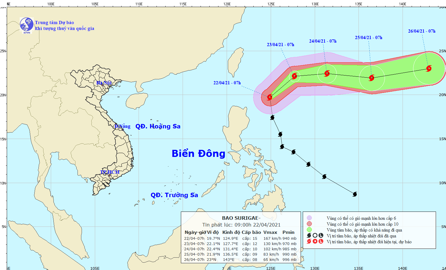 Dự báo, đến 7 giờ ngày 23/4, bão di chuyển theo hướng Đông Bắc, mỗi giờ đi được 15-20 km. Vị trí tâm bão ở khoảng 22,1 độ Vĩ Bắc; 127,7 độ Kinh Đông, cách phía Bắc đảo Luzon (Philippines) khoảng 720 km về phía Đông Bắc. Sức gió mạnh nhất vùng gần tâm bão mạnh cấp 12 (115-135 km/giờ), giật cấp 15.