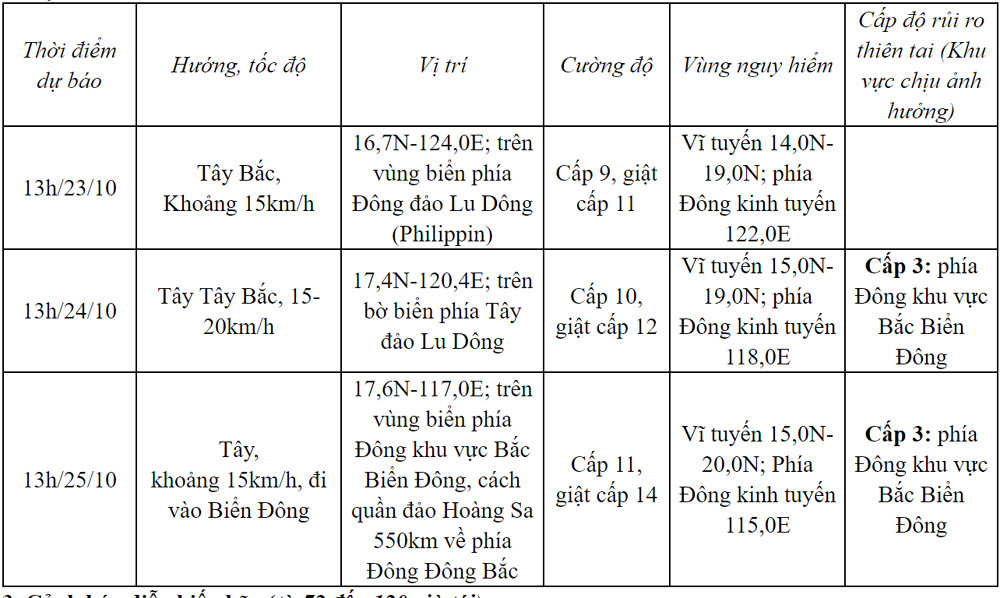 Vùng biển phía Đông khu vực Bắc Biển Đông gió mạnh cấp 6-7; từ sáng 24/10 tăng lên cấp 8-9, vùng gần tâm bão đi qua cấp 10-11, giật cấp 14, sóng biển cao 4-6m, vùng gần tâm bão 6-8m; biển động dữ dội.
