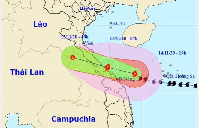 Trong sáng mai, bão theo hướng tây tây bắc với tốc độ 15-20 km/h. Đến 7h ngày 15/11, tâm bão trên vùng bờ biển từ Hà Tĩnh đến Thừa Thiên Huế, sức gió mạnh nhất 90 km/h, cấp 8-9, giật cấp 11.