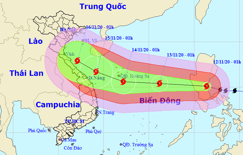 Các đài quốc tế đều dự báo bão khi đến gần đất liền sẽ không đi thẳng mà lướt dọc các tỉnh từ Quảng Nam ngược lên Hà Tĩnh, tâm bão đổ bộ vào Hà Tĩnh và Quảng Bình ngày 16/11.