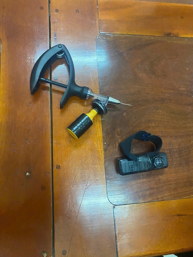 Đến khoảng 19h45 ngày 24/5, bằng sự nhạy bén và quyết liệt, lực lượng công an đã phát hiện Nguyễn Thành Thông đang điều khiển xe mô tô với nhiều biểu hiện nghi vấn. Tiến hành kiểm tra nóng, lực lượng chức năng đã thu giữ những tang vật không thể chối cãi: 1 ống chứa dung dịch màu xanh, 1 kim tiêm có chứa sẵn dung dịch màu xanh tương tự và 1 camera giấu kín đang được đối tượng mang theo.