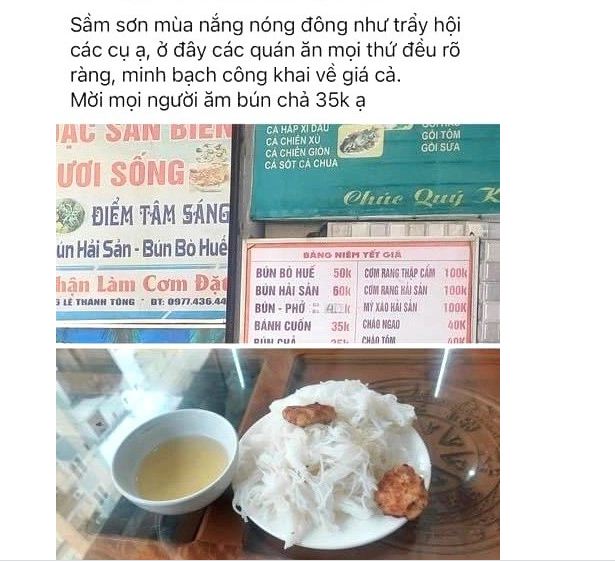 Sau khi kiểm tra, xác định sự việc xảy ra tại nhà hàng Đ.P., địa chỉ đường Lê Thánh Tông, phường Trung Sơn, thành phố Sầm Sơn. Nhà hàng có đủ điều kiện kinh doanh và có chứng nhận an toàn vệ sinh thực phẩm. Trước khi ăn, chủ quán cũng đã nói thẳng là suất 35K (35.000 đồng) chỉ được như thế thôi. Còn hình ảnh chụp lên còn thiếu rau, nước chấm nhưng khách chỉ chụp hình đưa bún và chả lên.