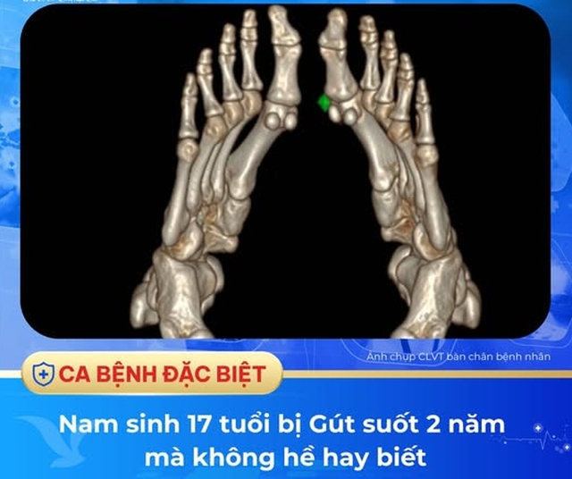 2 năm nay, nam học sinh L.M.H (nam, 17 tuổi, ở Hà Nội) xuất hiện nhiều đợt đau âm ỉ bàn ngón 1 chân trái, đau khi đi lại vận động, tự hết sau 3-5 ngày. Hai ngày trước, cháu H đau khớp bàn ngón 1 chân trái nhiều, sưng nóng, đau liên tục, tăng khi vận động, đôi khi đau về đêm nên đến BVĐK Medlatec để khám.