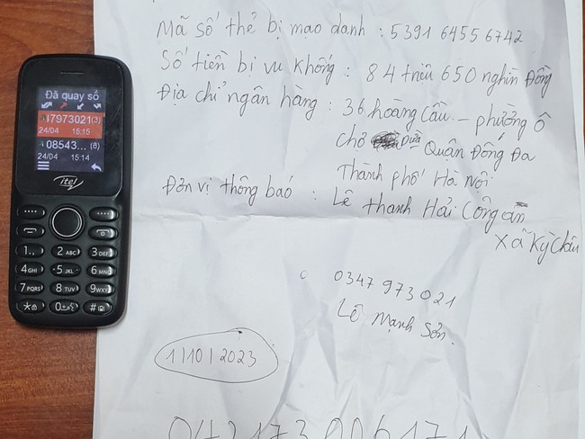Ngày 01/10/2023, có người khác mạo danh sử dụng thông tin của chị Tân vay nợ số tiền 84.650.000 đồng, mã hồ sơ 031873 của ngân hàng An Bình tại địa chỉ 36 Hoàng Cầu, P. Ô Chợ Dừa, Q. Đống Đa, TP. Hà Nội. Sau đó, chuyển máy kết nối đến số 0347973021 tự xưng là Lê Mạnh Sơn, cán bộ Công an TP Hà Nội.