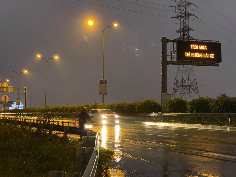 Chiều 23/11, trên địa bàn TP.HCM trời đổ mưa lớn, người tham gia giao thông trên đường dẫn cao tốc TP.HCM – Long Thành – Dầu Giây (HLD) thuộc quận 9 đã khá bất ngờ khi thấy bảng điện tử giao thông hiển thị dòng chữ: “trời mưa thì không lái xe”.