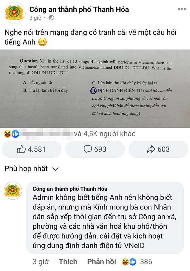 Sau khi BTC công bố sơ đồ sân khấu và giá vé cho concert Born Pink tại SVĐ Mỹ Đình, Fanpage Công an Thành phố Thanh Hoá tiếp tục gây bất ngờ về độ “bắt trend” khi đăng tải hình ảnh hóm hỉnh về câu tiếng Anh như trong đề thi tốt nghiệp THPT.