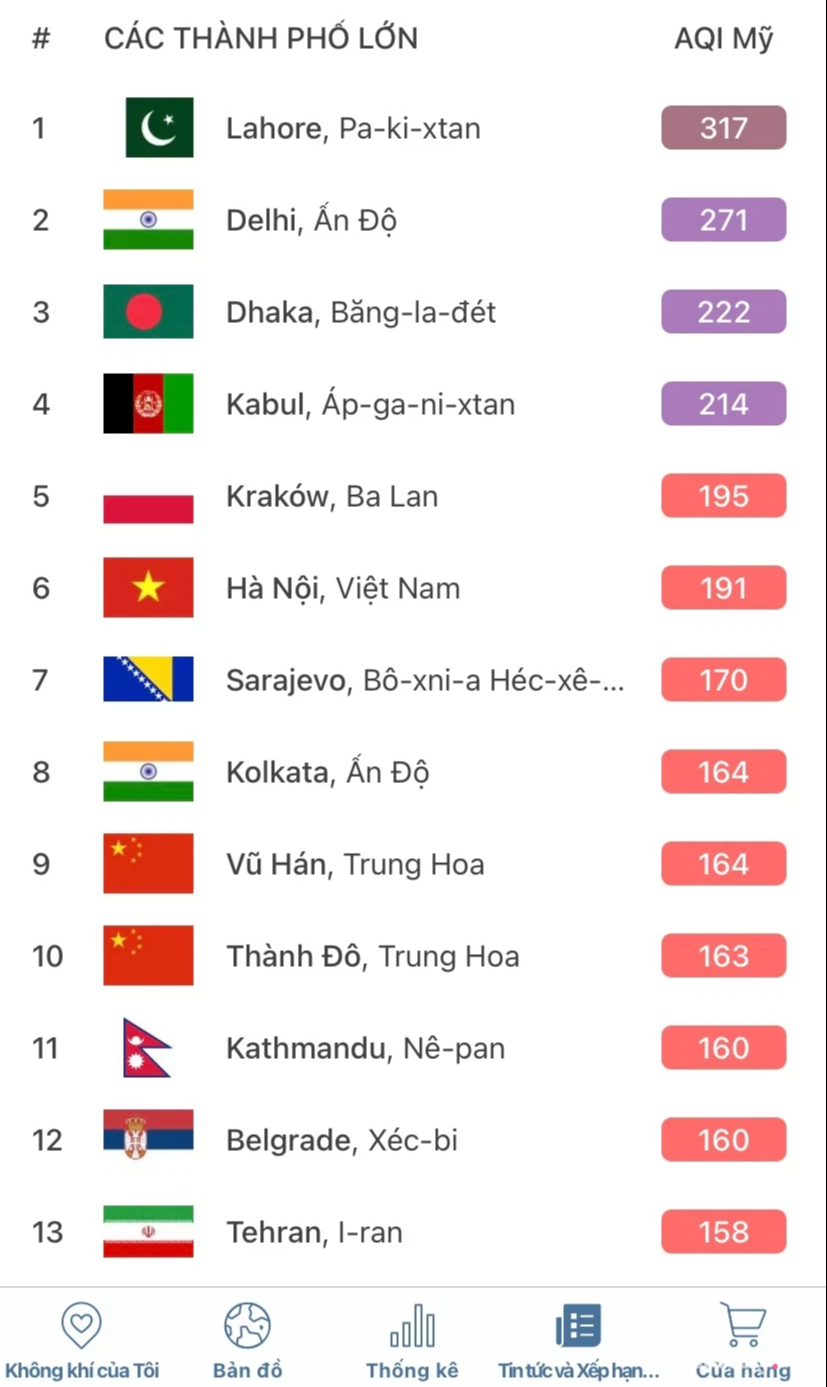 Theo thang bảng đo chỉ số chất lượng không khí (AQI) của ứng dụng AirVisual, trong số 95 thành phố của nhiều quốc gia trên thế giới được quan trắc, Hà Nội đứng thứ 4 với chỉ số AQI ở mức 205 (màu tím).
