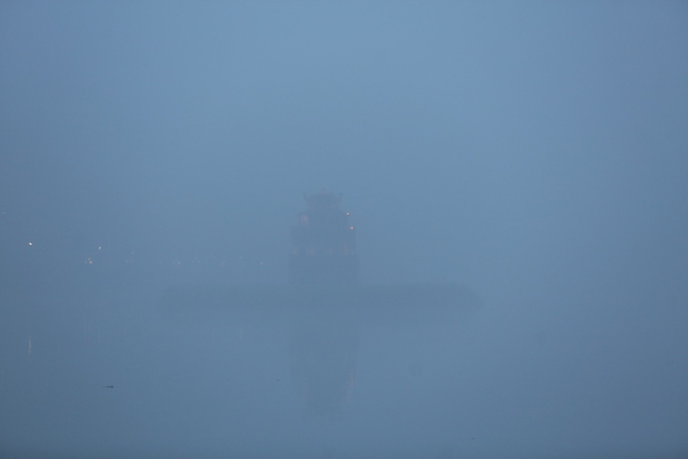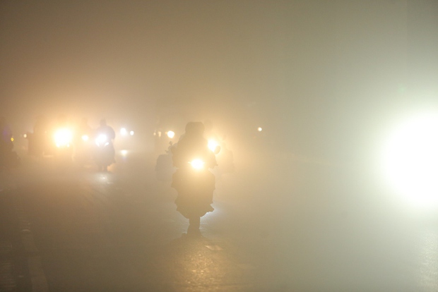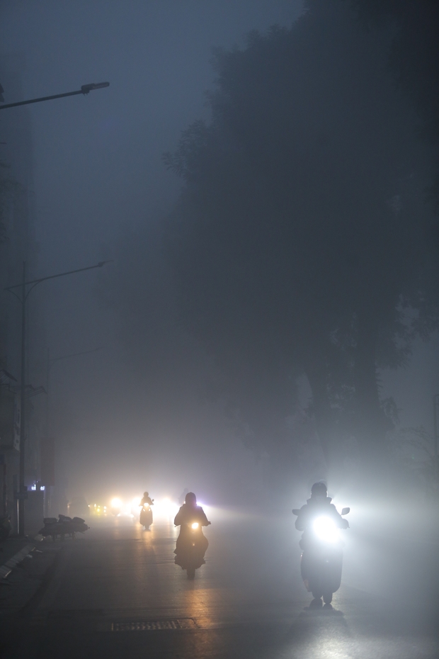 Đường phố Hà Nội chìm sâu trong lớp sương mù dày đặc, không khí đặc quánh.