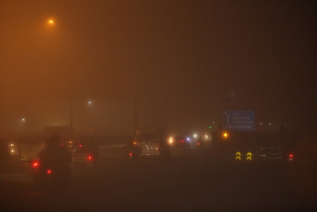 Đến 6 giờ sáng, bầu trời vẫn chìm trong sương mù, bụi mịn, người dân trong quá trình lưu thông trên một số tuyến đường của Thủ đô đều phải bật đèn do sương mù dặc đặc làm hạn chế tầm nhìn quan sát khi di chuyển.