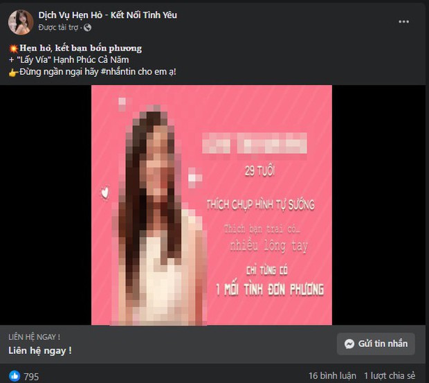 Tương tự, trên ứng dụng Facebook cũng xuất hiện nhan nhản các quảng cáo về nhóm kết bạn, hẹn hò khác giới. Thậm chí ngang nhiên quảng cáo mại dâm trá hình như "rau sạch"; "Điều đào 36 tỉnh thành"... Các bài đăng kết bạn thường được "thả thính" bằng những câu như: "Độc thân kết bạn làm quen. Nếu được thì nhắn tin yêu luôn!", "Em không xinh nhưng ai cũng phải ngước nhìn, tìm người tâm sự mỗi đêm", "Em cần người yêu thương em ở một mình nhà trọ buồn quá"; "Kết nối tình yêu không mất thời gian tán tỉnh"… kèm theo hình ảnh cô gái trẻ đẹp ăn mặc hở hang, khoe cơ thể.