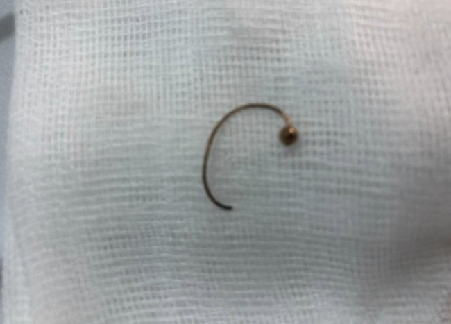 Sau khi được chuyển đến BV Nhi Đồng 1, các bác sĩ đã tiến hành gây mê soi cấp cứu và gắp được chiếc bông tai cách miệng thực quản khoảng 12cm. Bông tai có 1 đầu như chiếc kim gâm vào thành thực quản nên rất khó di chuyển.