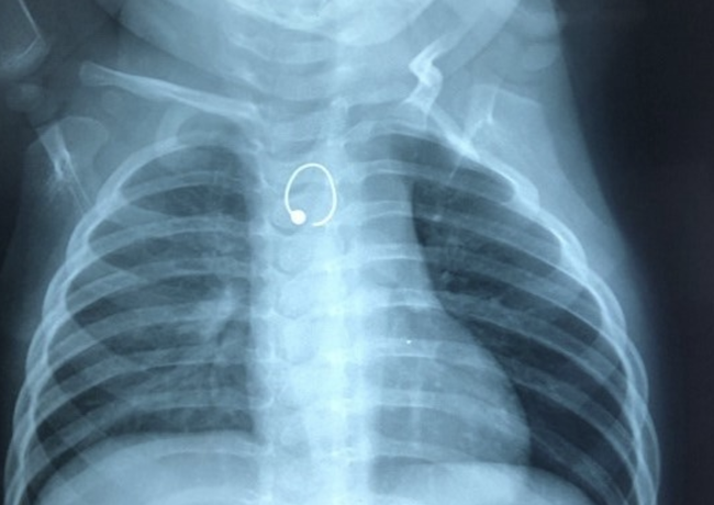 Cách nhập viện 1 tuần, bé thở mệt hơn kèm khò khè và bú ít lại. Khi đến khám tại BV địa phương, bé không giảm triệu chứng và chụp X-quang. Ảnh chụp nghi ngờ có dị vật cản quang vùng thực quản.
