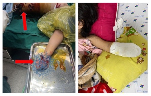 Ngay lập tức, trẻ được cấp cứu cắt lọc vết thương vùng mạn bụng trái, đùi phải, riêng vết thương bàn tay trái vỡ nát, không thể khâu nối, nên được làm mõm cụt. Trẻ được sử dụng thuốc giảm đau, kháng sinh.