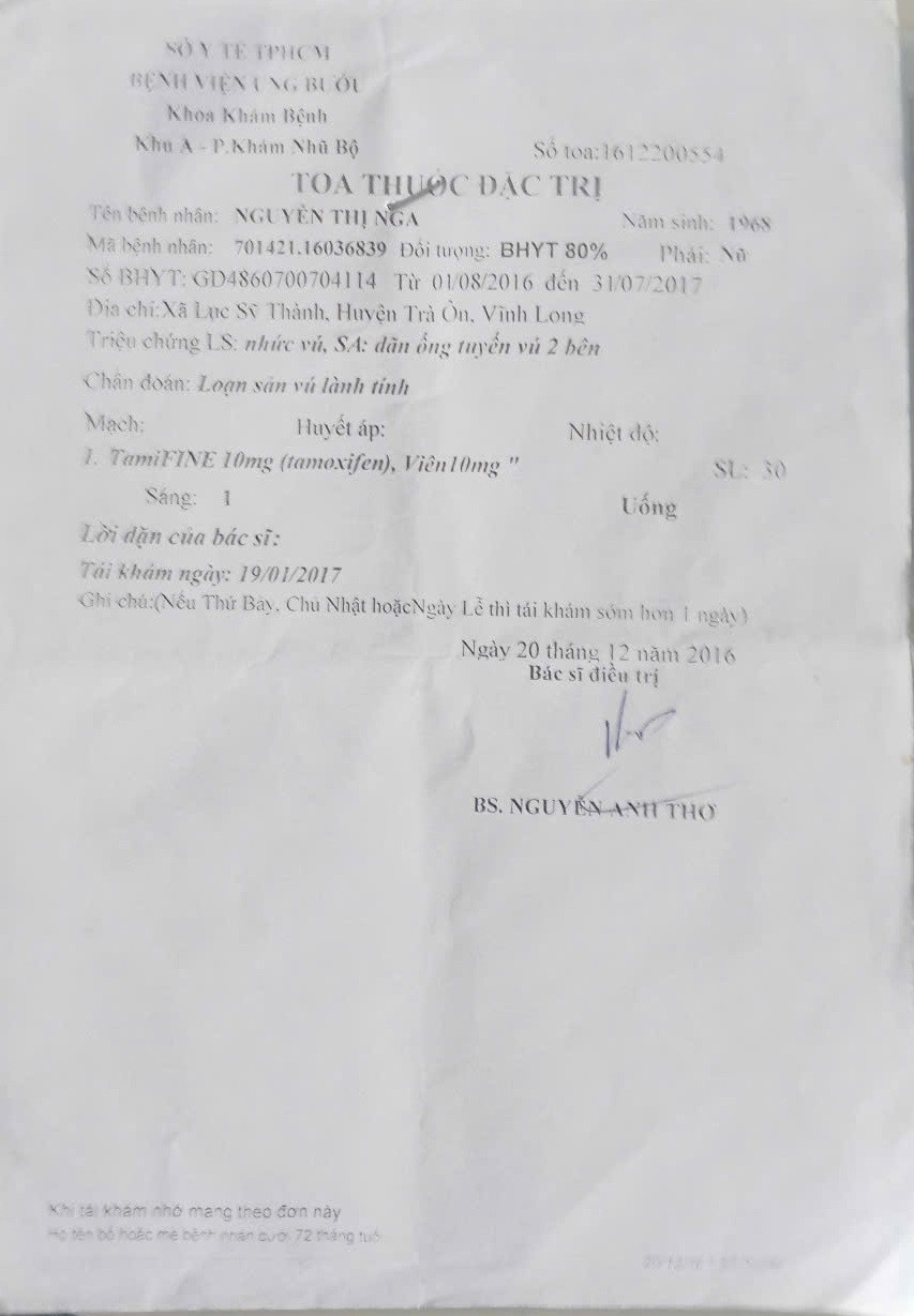 Còn bà Nga cũng chẳng khá hơn. Trước khi con gái phát bệnh, bà đã có tiền sử bệnh đường tiêu hóa, viêm xoang mãn tính. Cách đây 9 năm, bà đi khám vì đau nhức 2 bên vú, bác sĩ Bệnh viện Ung bướu TPHCM chẩn đoán bà bị loạn sản vú lành tính. Mấy năm nay, do không có điều kiện đi tái khám nên cứ mỗi lần bị đau, bà lại mua thuốc theo đơn cũ để uống.