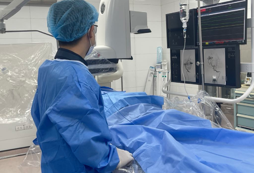 Ngay lập tức, các bác sĩ đưa ra hướng can thiệp nút tắc mạch hoàn toàn dưới hướng dẫn chụp mạch máu số hóa xóa nền (DSA). Phương pháp này giúp loại trừ nguy cơ tái diễn vỡ mạch máu làm tăng nặng tổn thương. Sau can thiệp, bệnh nhi được theo dõi sát.