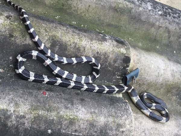Khoảng 5h ngày 8/1, chị Tr. giật mình bởi tiếng khóc thét của con trai. Vội bật đèn tỉnh dậy, chị Tr. hốt hoảng khi thấy 1 con rắn sọc đen trắng dài hơn 1m nằm ngay dưới gối con trai mình.