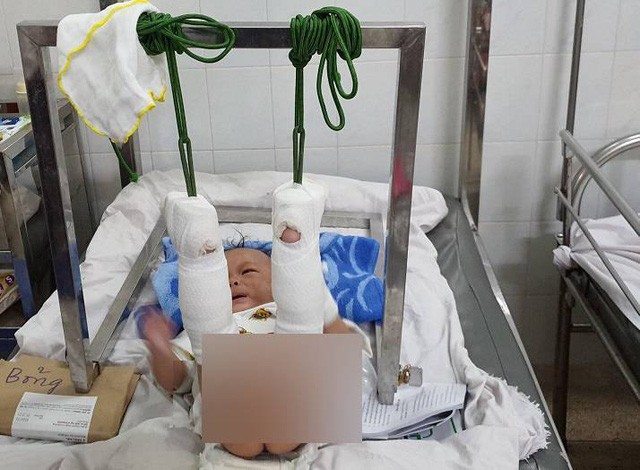 BS cho biết, bé K. sẽ phải treo chân như vậy ít nhất là 2 tuần lễ để theo dõi.