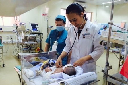 Bác sĩ Phạm Thị Thanh Tâm (áo trắng) đang kiểm tra sức khỏe cho bé Phát sáng 18-8 - Ảnh: L.TH.H. |