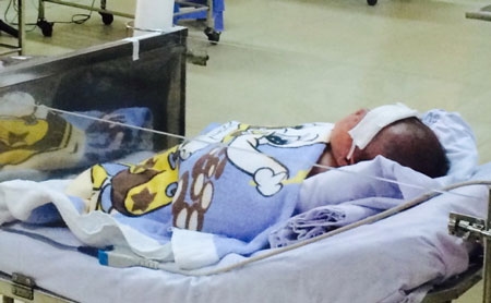 Sau ba lần được siêu âm kiểm tra sọ não, khối máu tụ trong và ngoài sọ không phát triển thêm, bé đã được cai máy thở, tỉnh táo, phản xạ tay chân cử động bình thường, gần như không bị tổn thương gì. Vết thương bên ngoài trán của bé đã được cắt chỉ, khô ráo, lành tốt, chỉ còn rỉ tí dịch nhưng ngày càng ít đi.