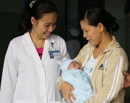 Bé Phát trong buổi tạm biệt các bác sĩ để theo bố mẹ về quê. Ảnh: Thiên Chương |