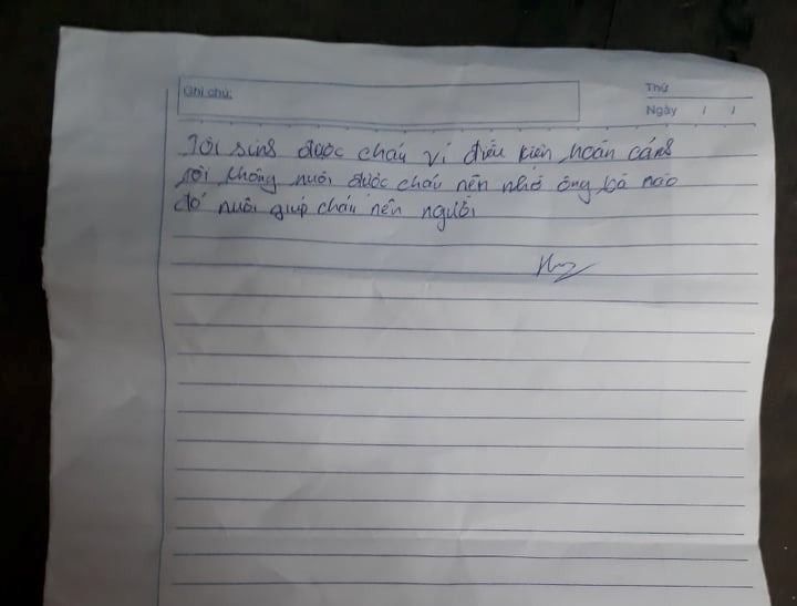 Khi kiểm tra, mọi người phát hiện trong hộp cacton có mấy bộ quần áo sơ sinh và một mảnh giấy ghi mấy dòng viết vội: "Tôi sinh được cháu nhưng vì điều kiện hoàn cảnh tôi không nuôi được cháu nên nhờ ông bà nào đó nuôi giúp cháu nên người", ngoài ra không có thông tin gì thêm.