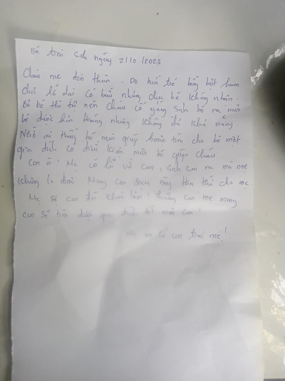 Thư viết: “Bé trai sinh ngày 2/10/2023. Cháu là mẹ đơn thân, do tuổi trẻ bồng bột ham chơi, lỡ dại có bầu nhưng cha cháu không nhận. Bỏ bé thì tội nên cháu cố gắng sinh bé ra nuôi được hơn tháng nhưng không đủ khả năng. Nhờ ai thấy bé nuôi giúp hoặc tìm cho bé một gia đình có điều kiện để nuôi bé giúp cháu”.