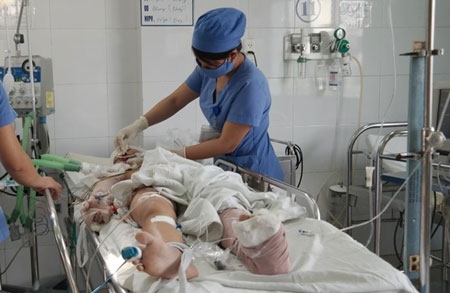 Cháu Trần Trọng Minh đang nguy kịch. Ảnh: Đoàn Nguyên. |