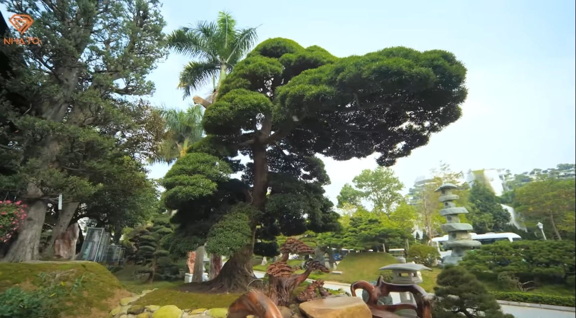 Trong khuôn viên sân vườn, gia chủ cũng chia các khu vực riêng để phân biệt các loại cây khác nhau. Ví dụ một khu riêng dành cho các loại cây cảnh của Việt Nam, một khu để cây của Nhật, riêng công vận chuyển về Việt Nam đã rất công phu. Trong khu cây cảnh Việt, đặc biệt nhất phải kể đến cây hồng xiêm được tỉa theo thế riêng, có tuổi thọ lên tới hơn 100 tuổi.