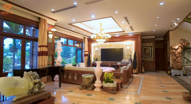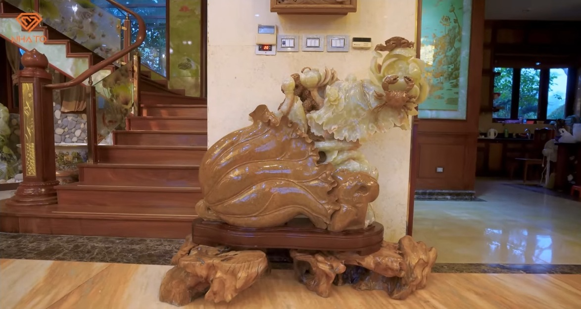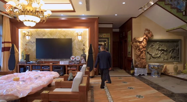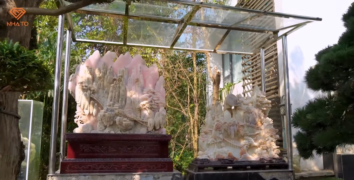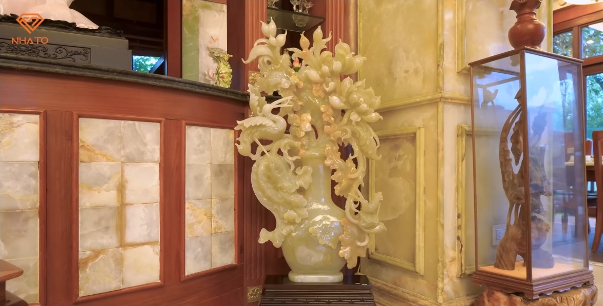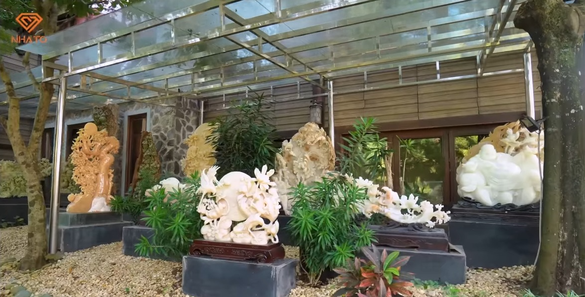 Gia chủ cũng hé lộ thêm, trong căn nhà còn rất nhiều những tác phẩm nghệ thuật bằng đá, ngọc, gỗ hóa thạch... nhưng ông chưa thể trưng bày và giới thiệu hết. Căn biệt phủ này đặc biệt đến mức, chiếm sóng cả 3 tập của kênh Nhà To. Từ khuôn viên sân vườn, BST các bức tượng bằng đá và ngọc, đến bên trong căn nhà nơi gia chủ sinh hoạt... tất cả đều mở ra những không gian nghệ thuật thể hiện rõ niềm đam mê bất tận của vị phó chủ tịch tuổi U70 này.