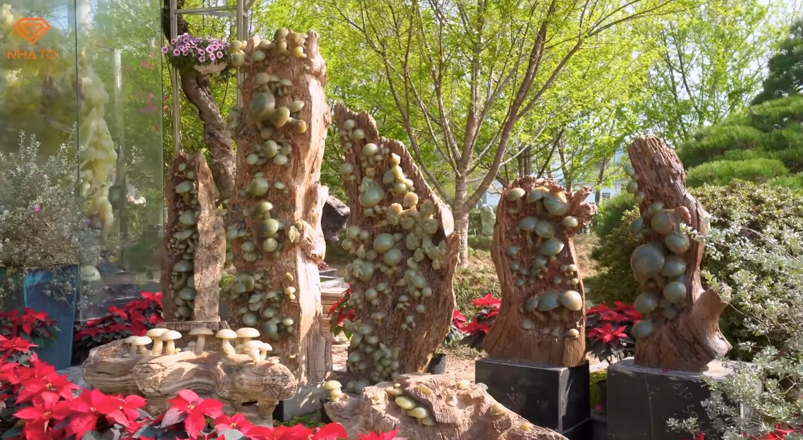 Ngoài đam mê về cây cổ, gia chủ còn sưu tầm đá quý và gỗ hóa thạch và được bài trí khắp khuôn viên và trong nhà. Xung quanh khuôn viên, ông bày trí nhiều tác phẩm điêu khắc từ ngọc và đá quý, thể hiện các chủ đề như vườn nho, bàn tiệc và nấm, với nguồn gốc từ nhiều nước và vùng miền tại Việt Nam. Đặc biệt, các tác phẩm từ ngọc đều là nguyên khối, không qua cắt ghép.