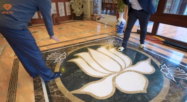 Trên sàn nhà là một bức tranh sen được làm bằng đá và ngọc, phần hoa sen chính giữa là ngọc trắng, còn lại là đá. Gia chủ muốn để bức tranh này để khách đến có thể cảm nhận và ngắm nhìn một cách rõ nét nhất phong cách thiết kế của nội thất trong nhà cũng như đam mê của bản thân được gửi gắm qua từng chi tiết.