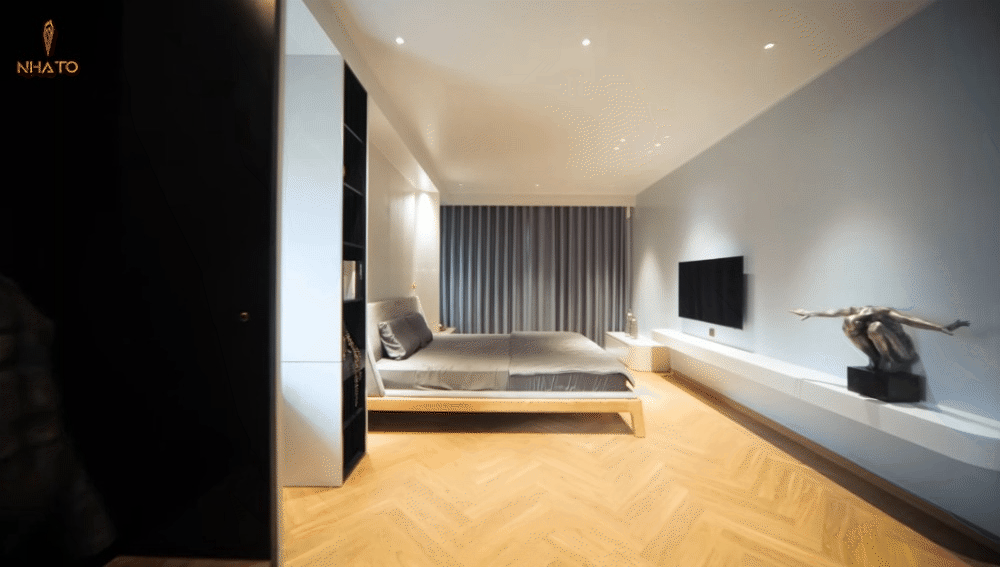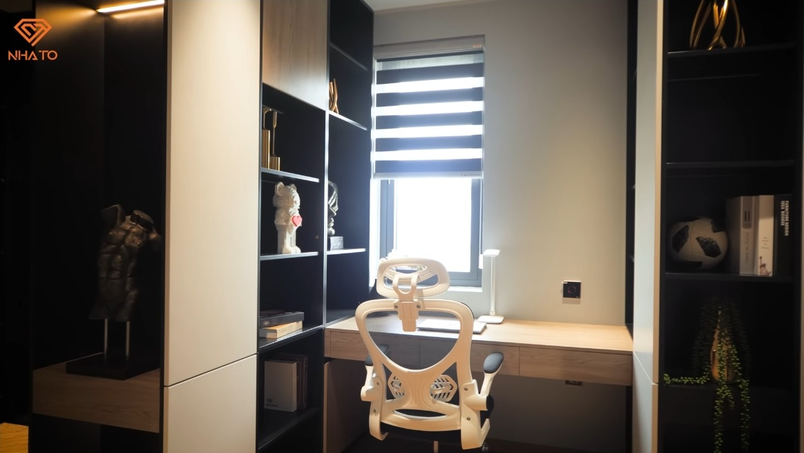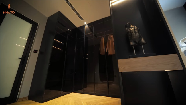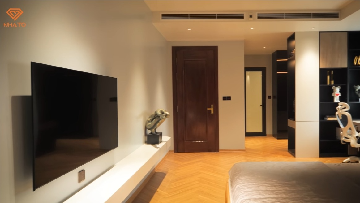 Không gian riêng tư của gia chủ cũng khá đặc biệt. Một cậu bé 15 tuổi nhưng lại thích sự tinh giản và hiện đại chứ không ngập tràn đồ chơi hay mô hình như các bạn đồng trang lứa. Không gian phòng ngủ mở ra với chiếc giường lớn đặt chính giữa căn phòng, bên cạnh là bàn học, kệ đựng đồ và phòng thay đồ.