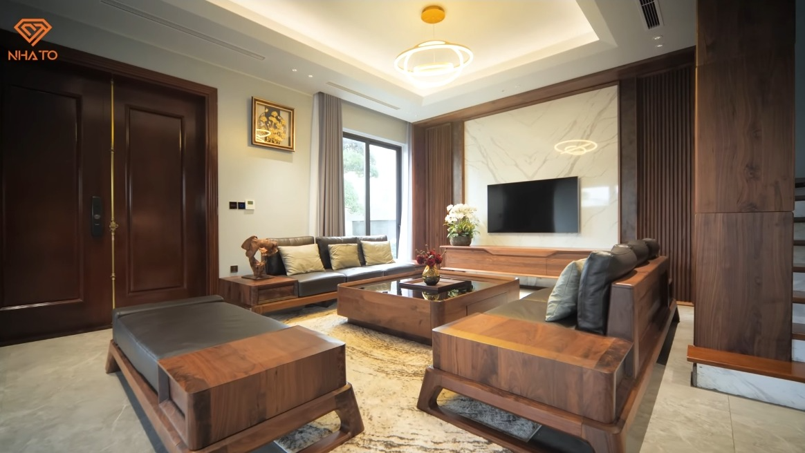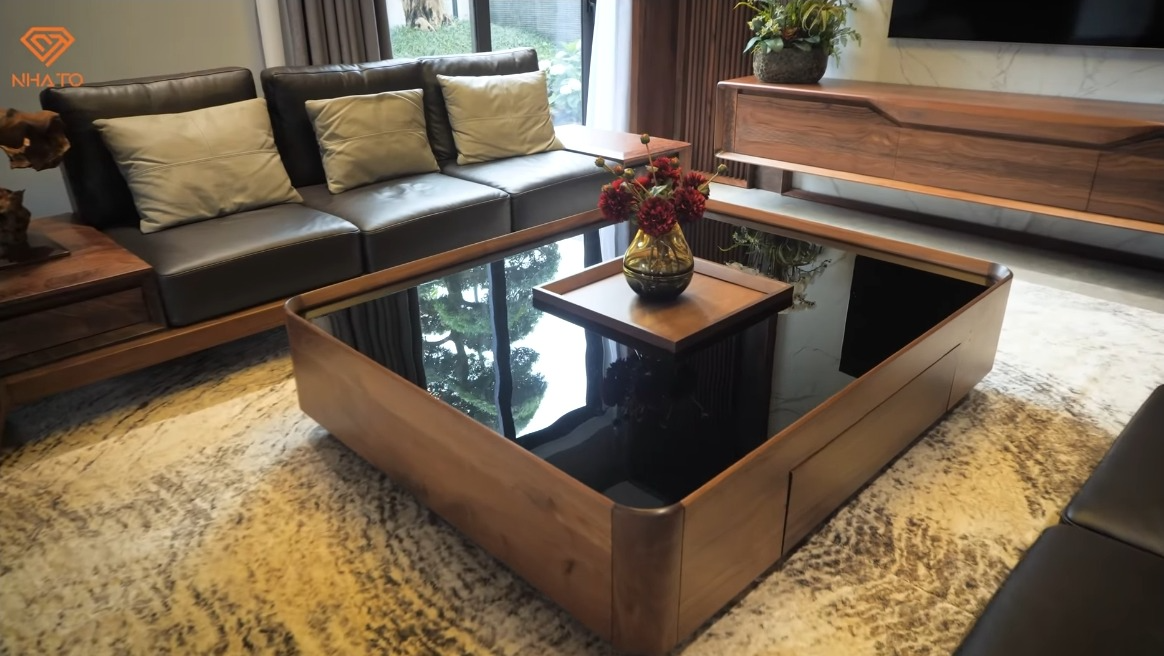Bước vào bên trong là không gian phòng khách với nội thất được thiết kế tối giản, hiện đại. Cậu bé dùng gỗ óc chó để làm toàn bộ nội thất như bàn ghế, tủ kệ của phòng khách. "Cháu có tìm hiểu trên truyền hình và cháu cũng rất thích phong cách hiện đại và sang trọng của gỗ óc chó" - Nam chia sẻ.