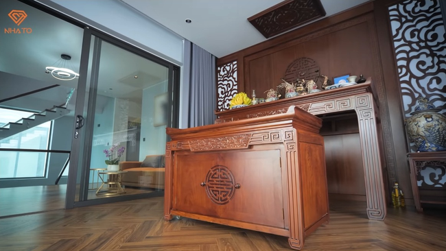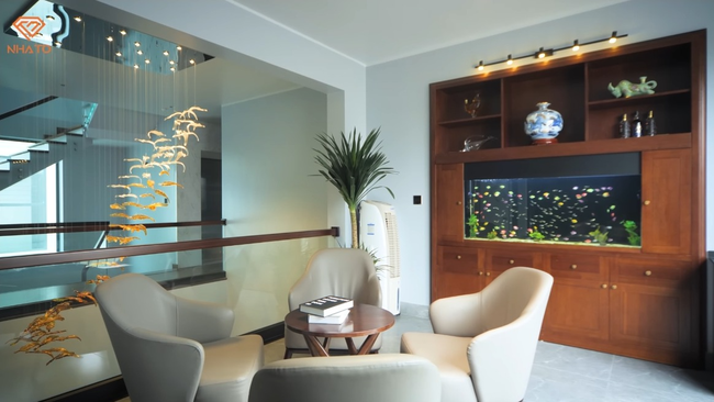 Chính giữa phòng là bộ salon gỗ óc chó mang một gam màu trầm ấm, tất cả nội thất trang trí cũng không cầu kỳ mà thiên về nét hiện đại, tinh giản. Ngay từ phòng khách, người xem đã bất ngờ về gu thẩm mỹ cũng như khả năng thiết kế của cậu bé 15 tuổi này.