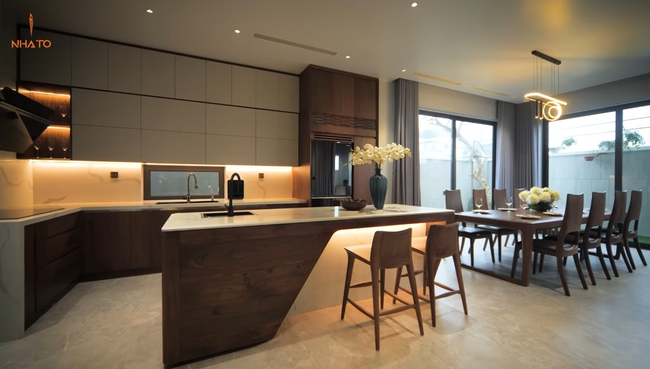 Phòng khách thông với gian bếp tạo sự thông thoáng và rộng rãi cho toàn bộ căn nhà. Có thể thấy, toàn bộ nội thất trong nhà đều thiên về phong cách hiện đại tinh giản. Không gian phòng bếp không quá rộng nhưng được bao quanh là cửa kính, có thể tận dụng ánh sáng tự nhiên và "cơi nới" thêm khoảng không cho căn phòng.