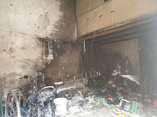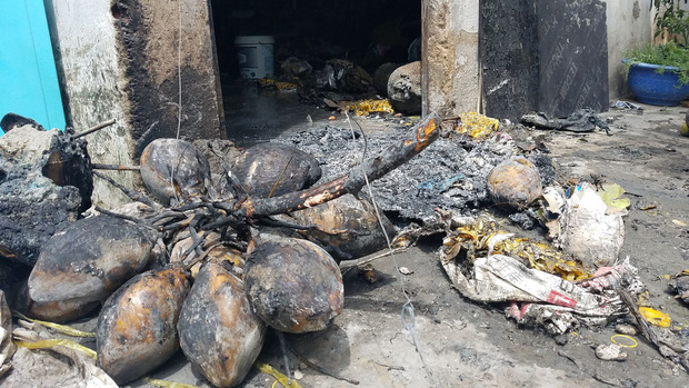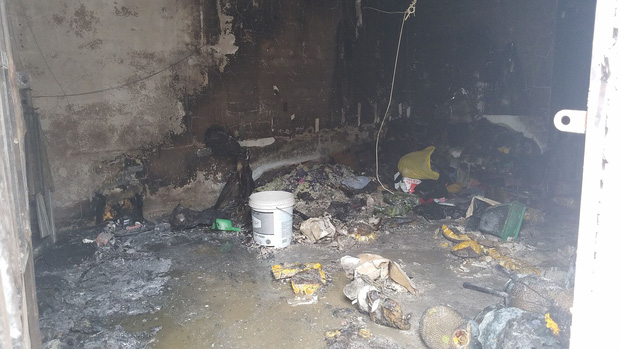 Bên trong căn phòng trọ chỉ còn lại đống đổ nát sau vụ cháy. Hầu hết tài sản đã bị thiêu rụi, đến trái cây còn sống cũng bị cháy đen mềm nhũn. Mọi vật dụng và quần áo đều bị cháy vo cục khiến người dân ám ảnh.