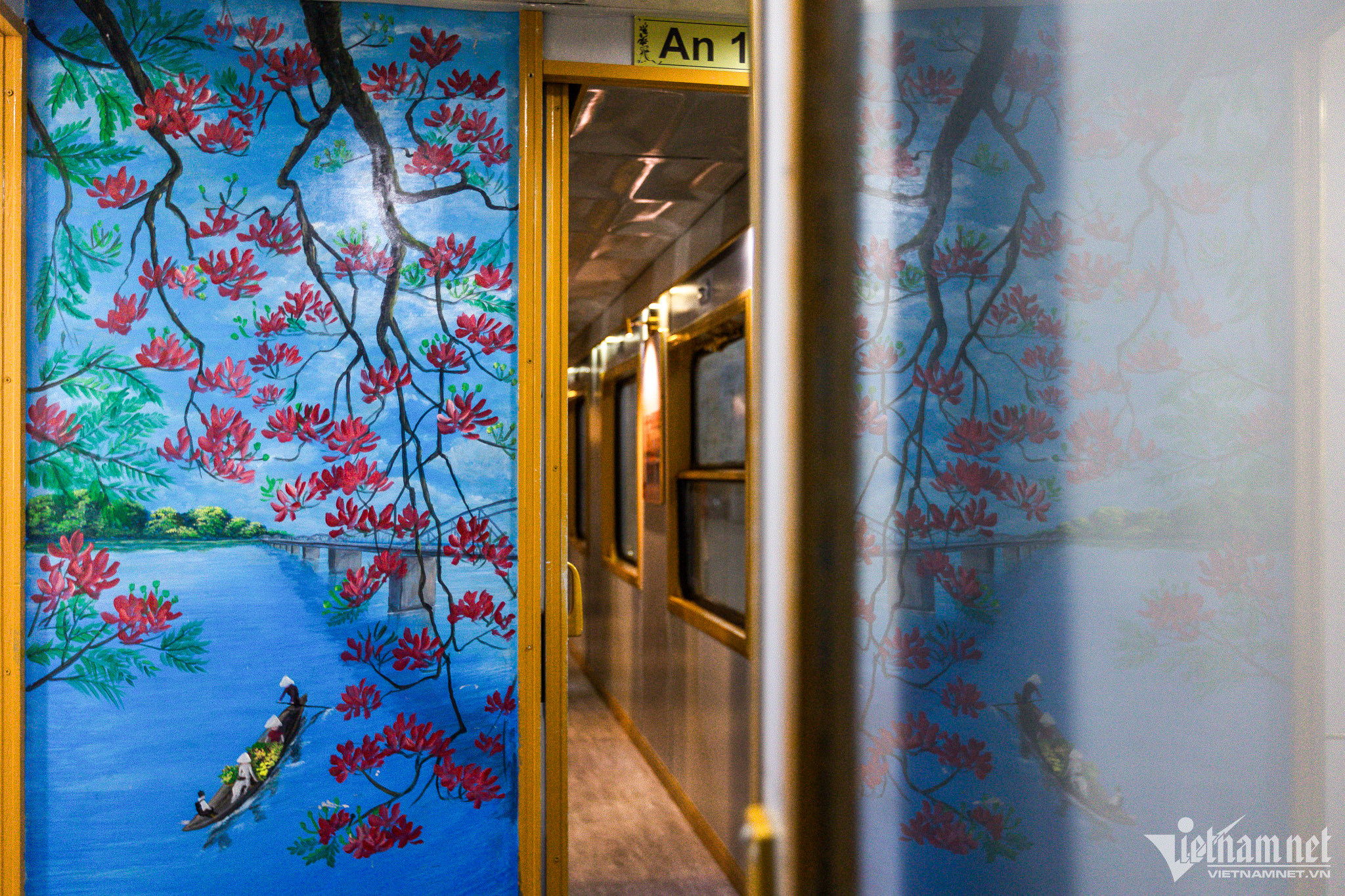 Phía bên trong các toa tàu, những mảng vách trơn thông thường không còn, thay vào đó là các bức tranh khổ lớn danh lam, thắng cảnh ở Việt Nam.