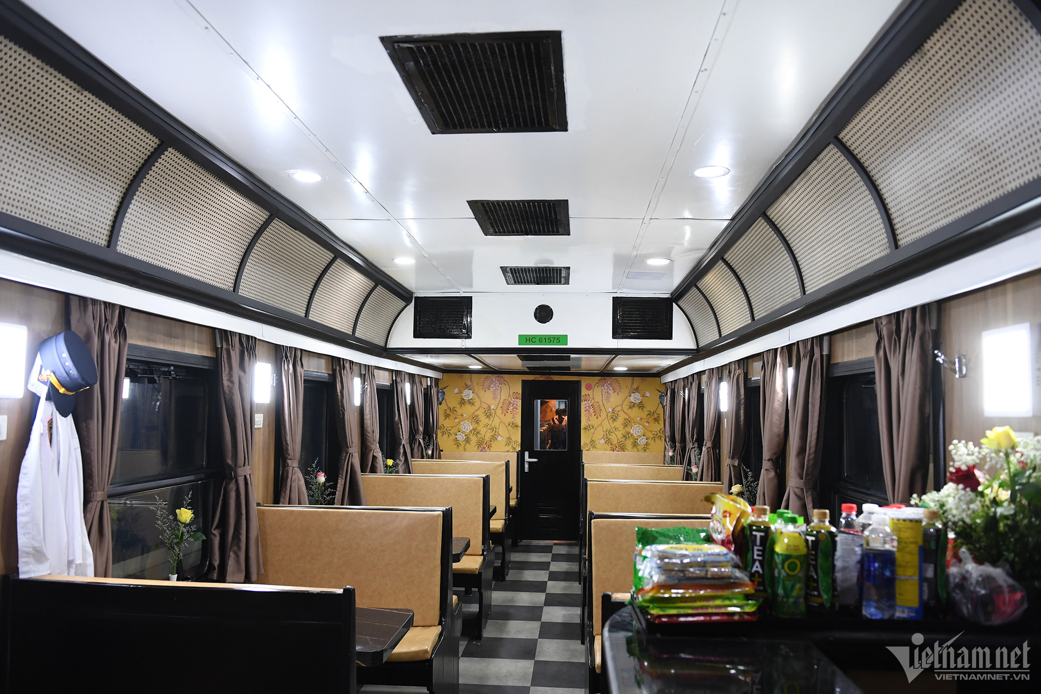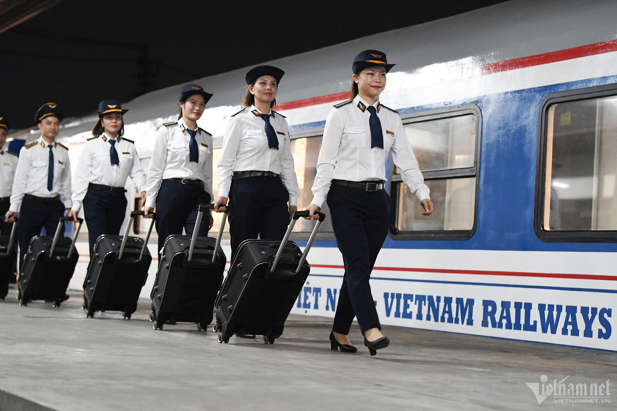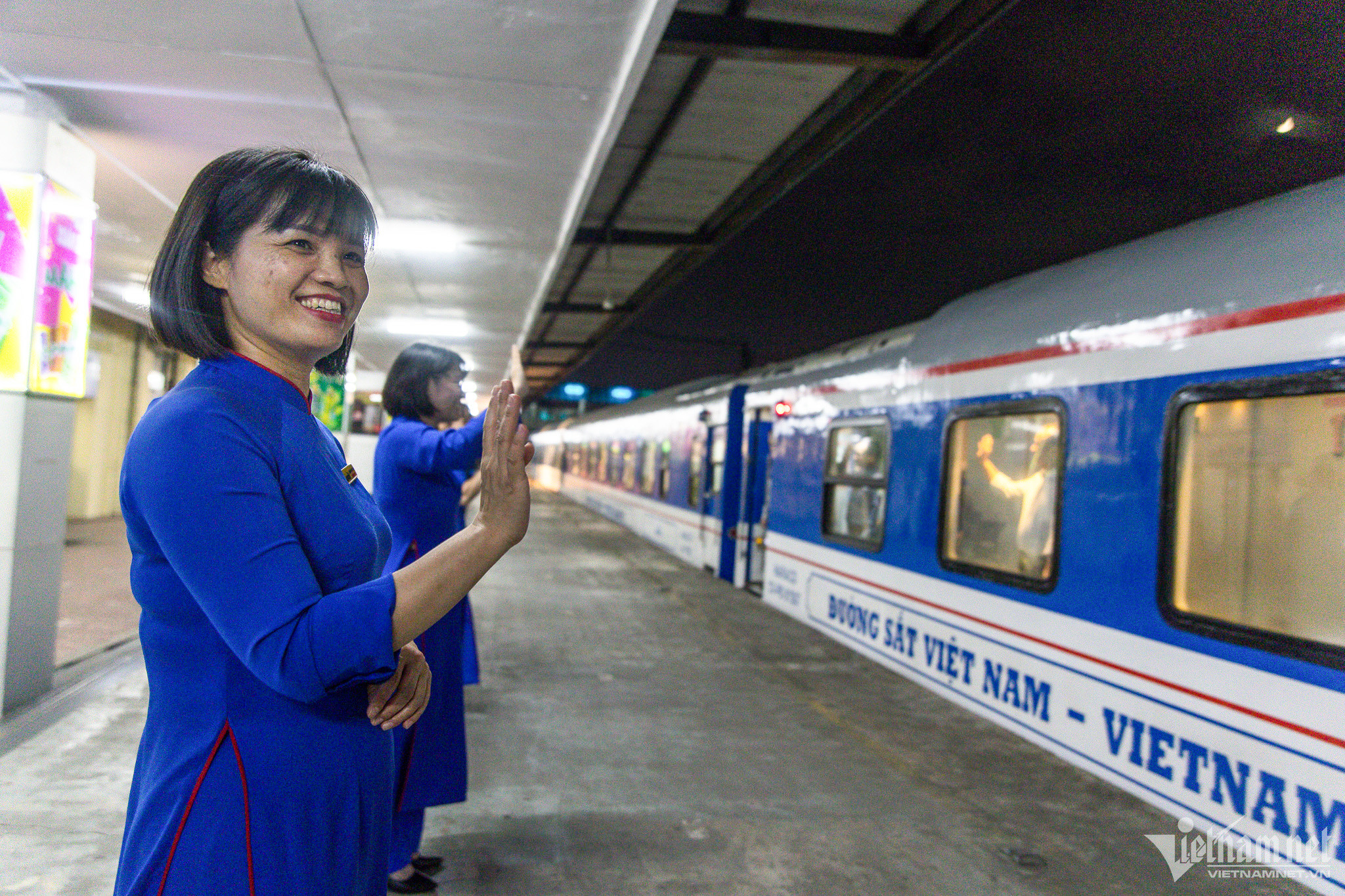 Tối 20/10, đoàn tàu chất lượng cao SE19 với các toa xe đóng mới vừa hoàn thiện, bắt đầu đưa vào sử dụng. Nhân viên làm việc trên chuyến tàu này được trang bị đồng phục màu trắng, tạo sự thanh lịch, trang trọng hơn so với màu xanh cũ. Ảnh: Hoàng Anh.