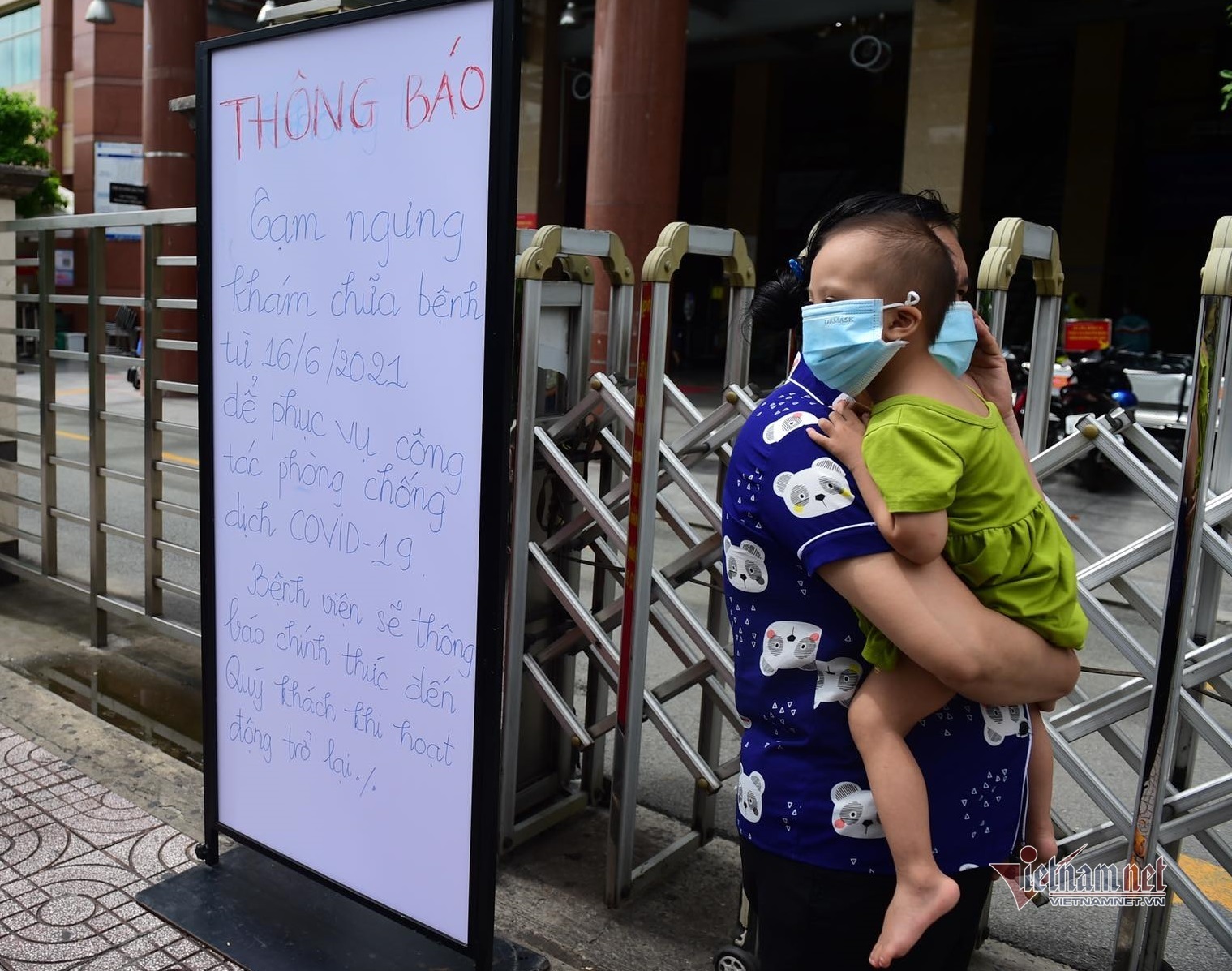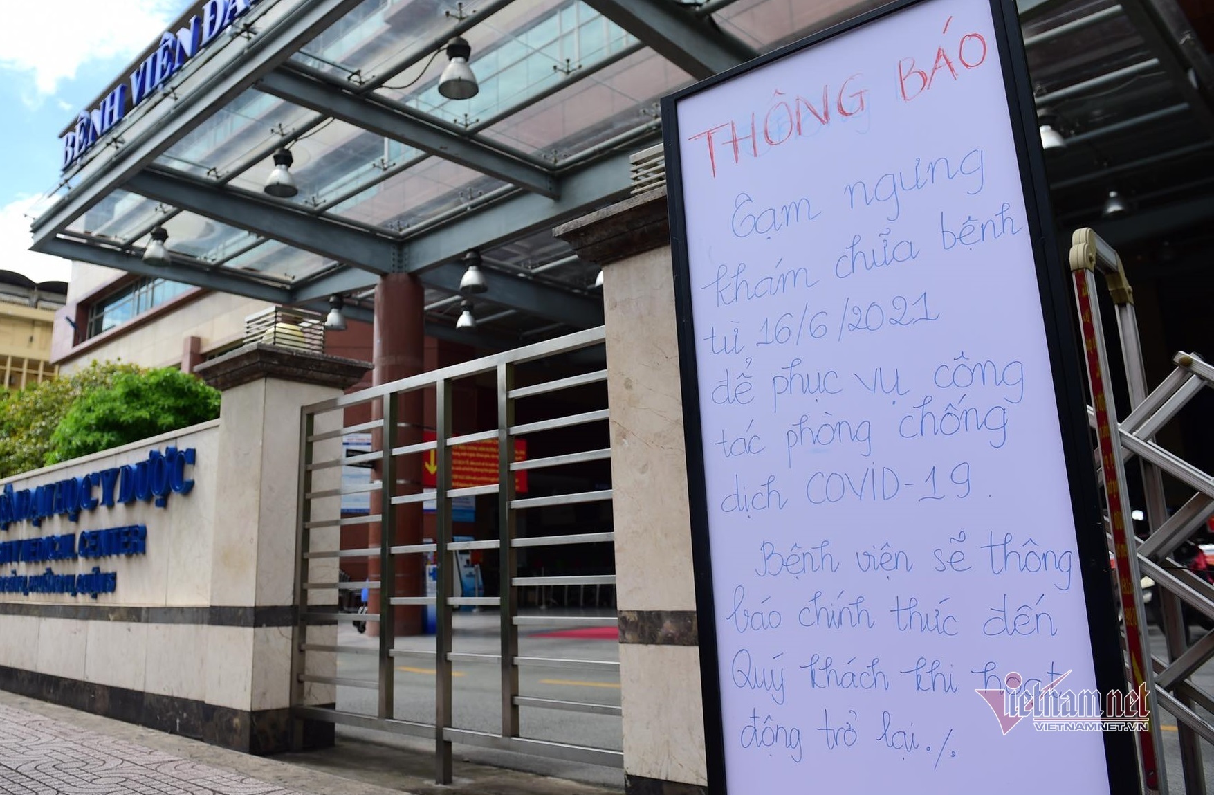 Theo quan sát, các cổng vào bệnh viện Đại học Y Dược TP.HCM đóng chặt và trưng biển tạm ngưng tiếp nhận người đến khám ngoại trú nhằm tăng cường công tác phòng, chống dịch Covid-19.