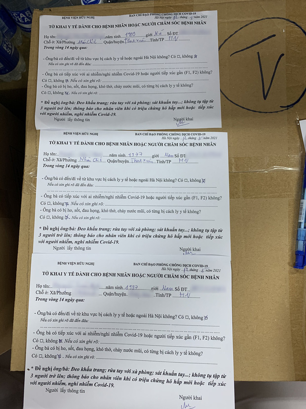 Khi khai báo y tế, cả 3 đều khai "không đến/về từ vùng dịch", "không tiếp xúc với ai nghi/ nhiễm Covid-19", "không có biểu hiện ho, sốt, đau họng, chảy mũi". Đặc biệt cả 3 tờ khai đều cùng nét chữ, số điện thoại và chữ ký.