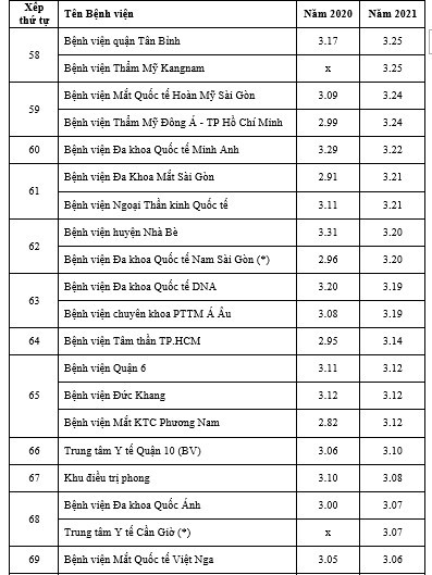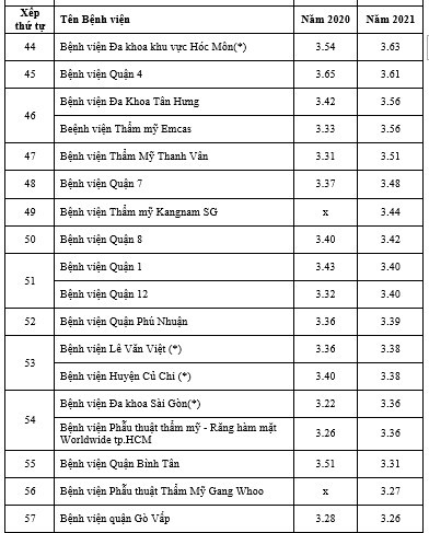 Sở Y tế nhận định, nhìn chung, sau nhiều nỗ lực, các bệnh viện đã duy trì được chất lượng so với năm 2020 một số bệnh viện có nhiều cải tiến trong hoạt động chuyên môn và phối hợp tốt công tác chống dịch. Trong 32 bệnh viện đạt điểm trung bình từ 4 điểm trở lên (mức chất lượng tốt) có 10 bệnh viện đạt trên 50% số tiêu chí mức 5 (mức tối đa) gồm Bệnh viện Hùng Vương (4,69), Từ Dũ (4,6), Nhân dân 115 (4,59), Viện Y Dược học Dân tộc (4,56), Hoàn Mỹ Sài Gòn (4,54), Nhi đồng 1 (4,53), Nhân dân Gia Định (4,5), Bình Dân (4,49), Đa khoa Quốc tế Vinmec Central Park (4,40), Đa khoa Tâm Anh (4,43). Bên cạnh đó, có 69 bệnh viện điểm trung bình từ 3 điểm trở lên trong đó có 2 bệnh viện thuộc bộ, ngành. Nhóm bệnh viện có điểm trung bình dưới 3 có 16 bệnh viện (giảm 24% so với năm 2020). Trong đó, bệnh viện Răng hàm mặt Sài Gòn có điểm chất lượng thấp nhất với 1,81.