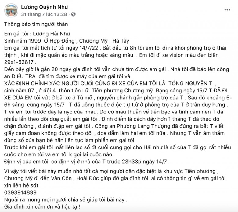 Quỳnh Như cho biết, qua xác minh định vị, vào lúc 23h33 ngày 14/7, em gái có mặt ở nhà của T. Gia đình hiện đang khẩn thiết tìm kiếm tung tích của Hải Như. Bên cạnh việc trình báo cơ quan chức năng, người nhà của thiếu nữ 23 tuổi còn lên mạng xã hội nhờ vào các hội nhóm để chia sẻ thông tin rộng rãi.