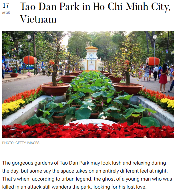 Theo như thông tin được đăng tải trên Travel Leisure, Công viên Tao Đàn được mô tả rằng: "Những khu vườn tuyệt đẹp của Công viên Tao Đàn có thể trông tươi tốt và thư giãn vào ban ngày, nhưng một số người nói rằng nơi này mang một cảm giác hoàn toàn khác vào ban đêm. Đó là lúc, theo những đô thị, hồn ma của một chàng trai trẻ bị giết trong một vụ tấn công vẫn lang thang trong công viên, tìm kiếm tình yêu đã mất của mình".