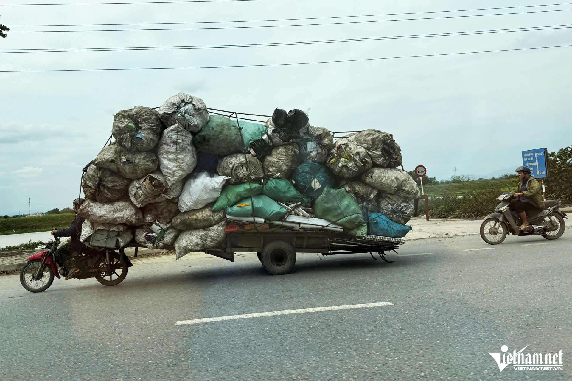 Cũng trên đường trục phía nam (đoạn gần lối rẽ thôn Sinh Liên, xã Bình Minh, huyện Thanh Oai), hướng Hà Đông đi Thanh Oai, một xe máy kéo theo xe hàng cao "ngất ngưởng".