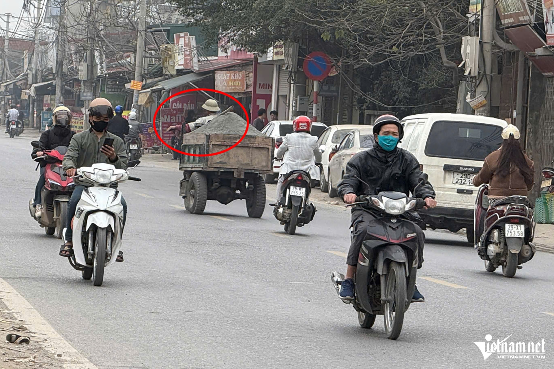 Cách đó không xa, trên đường trục phía nam (đoạn gần Khu đô thị Thanh Hà, huyện Thanh Oai), có 2 xe ba bánh tự chế chở theo hàng hóa. Đáng chú ý, tại phần thùng hàng còn chở theo người, gây mất an toàn giao thông.